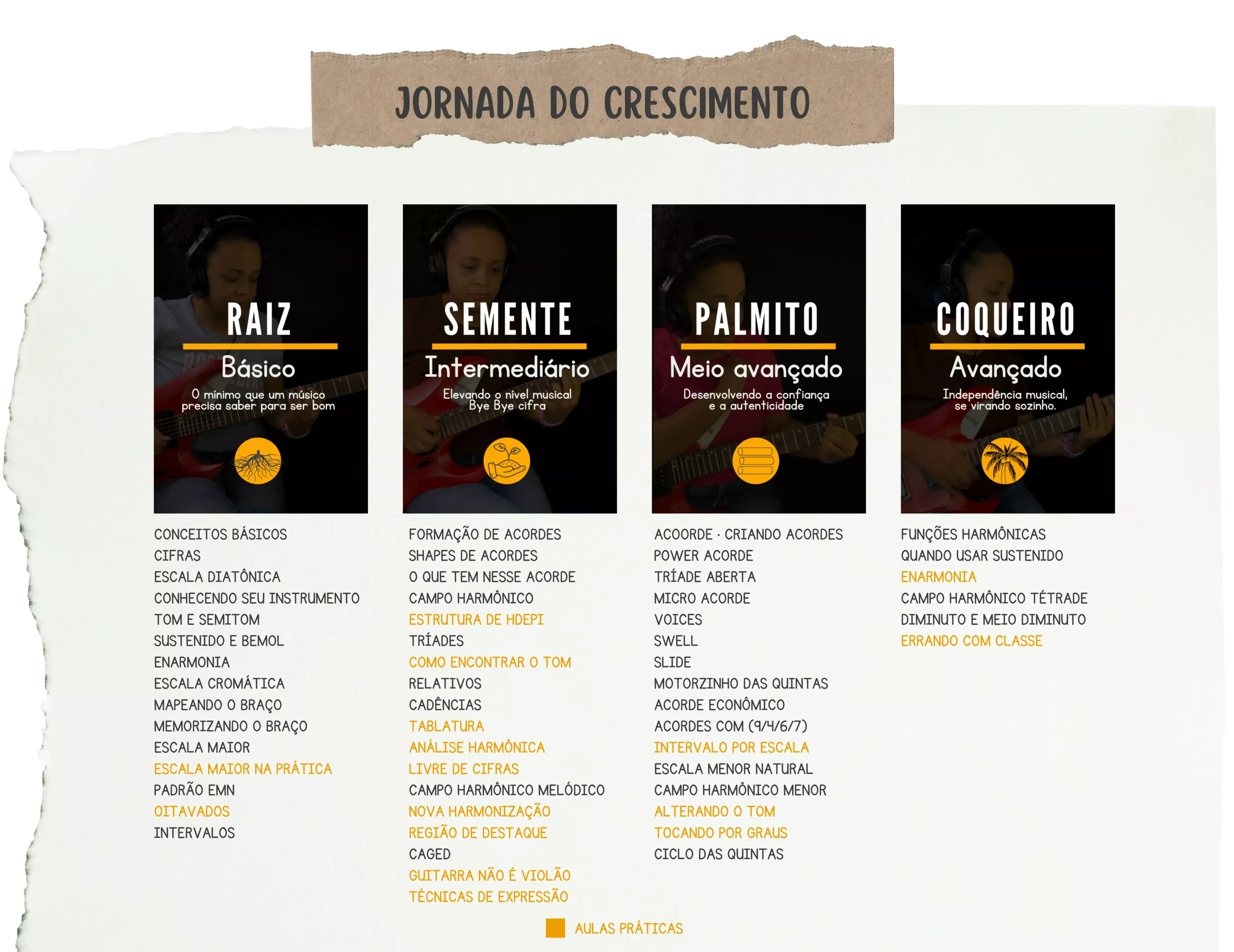 O método une teoria e prática e encurta o caminho para outros guitarristas, oferecendo ferramentas como a ESTRUTURA DE HDEPI que destrava o campo harmônico. O conhecimento de forma organizada e estruturada segue a jornada do crescimento que guia o guitarrista do básico ao avançado, ajudando-o a ser um músico CONFIANTE, CRIATIVO e AUTÊNTICO.